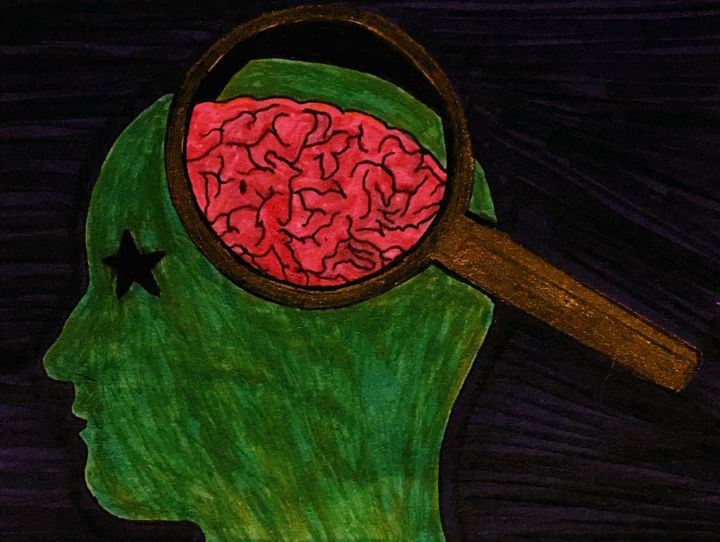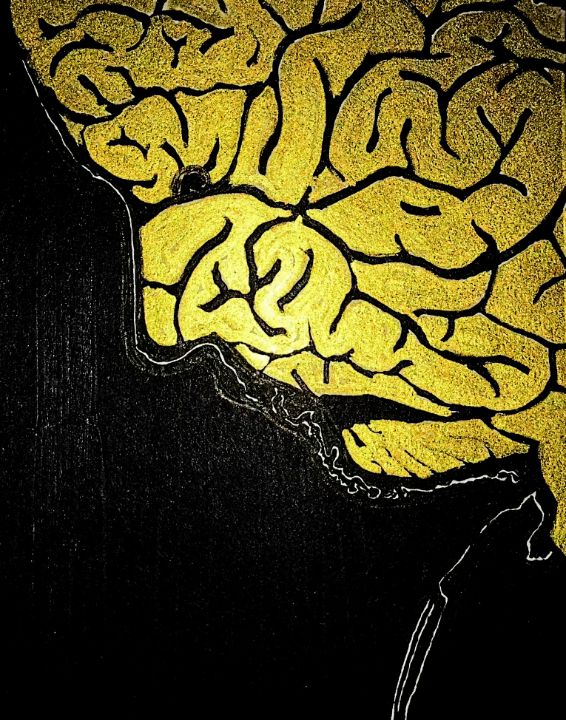 In this juxtaposed color and abstractive thought provoking side portrait of a reptilian green, star eyed figure, we see a view into the brain cavity via an X-ray microsope. Though the brain appears to be mainly pink and healthy, there are so many relevantly suggestive features to this otherwise seemingly simple portrait that begs of the piece’ title: “How Well Do We”…?