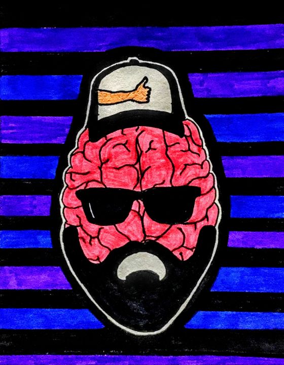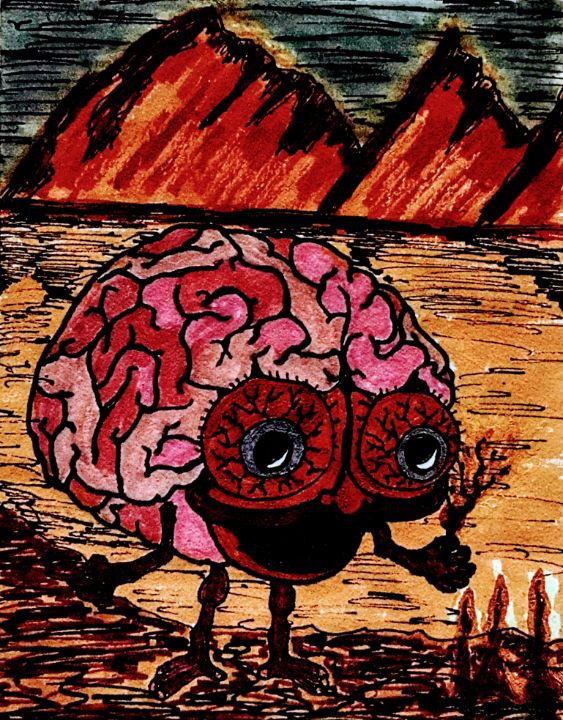 In this rendering of a brains maniacal side we see the chaos a brain can endure or even create itself. With bulging blood shot eyes filled with the look of craze, and a grimaced jaw agape the brain holds a torch in one hand while surrounded by volcanoes and a lake of fire. With the intentions unclear it arises many questions as to what are the motives and or the situation. Upon reflection one can begin to wonder what lies within ourselves, what fires do we have, what smoldering embers still burn at our core.