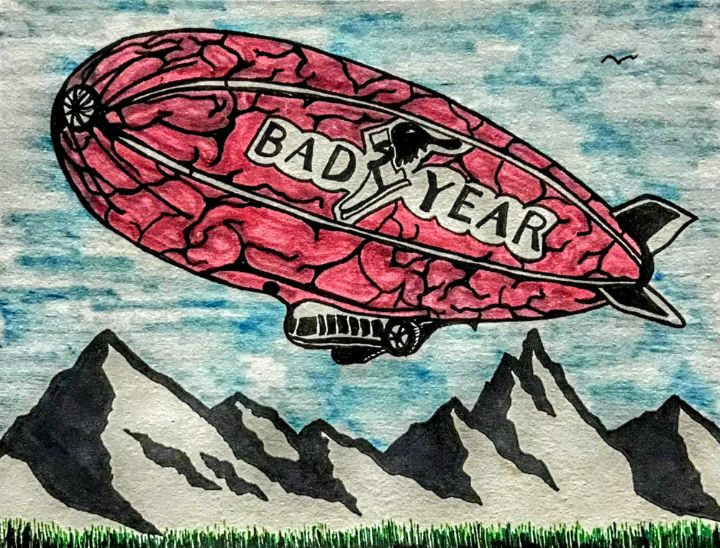 The “Bad Year Blimp” seen in this comical twist of sky high imagery is one of ethereal thoughts up in the clouds grounded by the assimilation to an actual Blimp which is one of curiosity in the start. with melancholic somewhat foggy yet clear skies, we are left to wonder______..?