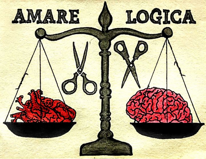 Upon the hypothetical scales of justice are placed both the human heart opposed with the brain. These anatomical depictions in color stand out in contrast to the cold hard metallic scale. With frayed chords that hold the scales plates, and suggestive scissors in the field; there are many facets to ponder here in this Philosophical dilemma. The Latin word “Amare” or love hang tightly above the heart while over the brain reads “Logica” or logic. With the scales not tipped in either direction it suggests that both are highly important but equal in value.