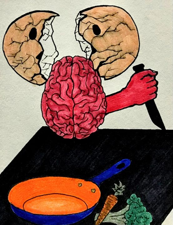 In a dream like fantasy world we find ourselves in what seems to be a kitchen. While the human brain is emerging from a hovering and cracking egg, it is holding a knife and preparing to cut some fresh vegetables. On the table that lies in the foreground sits an awaiting frying pan.