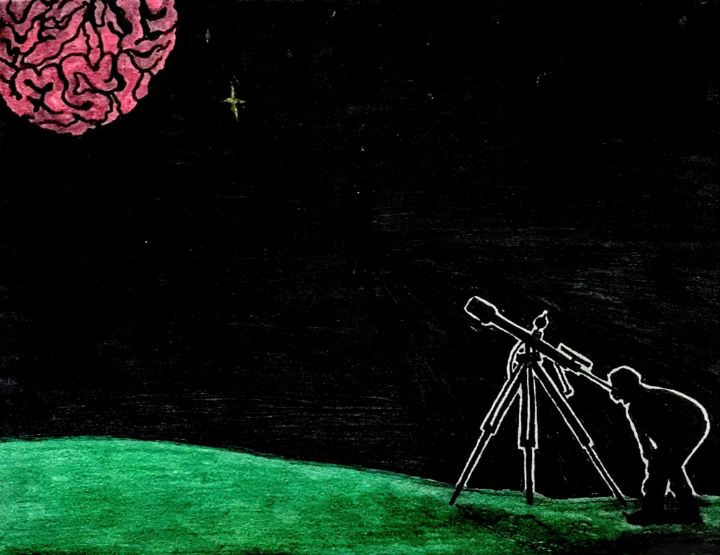 Astronomy is a great subject of Art. Here we see an amateur Astronomer at work in the field; star gazing. Yet in this scenario The viewer has his telescope set on a planetary object that is the brain. This suggests that the human mind is something that is visible, yet far off and distant, leaving it up for much study.