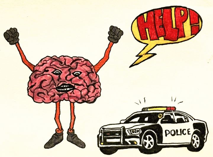 In this tragic expose of a mental health crisis scene we see a large and generally disturbed anthropomorphized brain with arms in the air and a sense of fear or impending doom in the eyes. This brash imagery leaves one with a feeling of sympathy or misunderstanding in the least for the figure. Above the “head” we see a large cartoon analog balloon reading; HELP! With the loud shout and the active police squad car in the immediate foreground one can only begin to assume that the situation portrayed is one of most dire means.