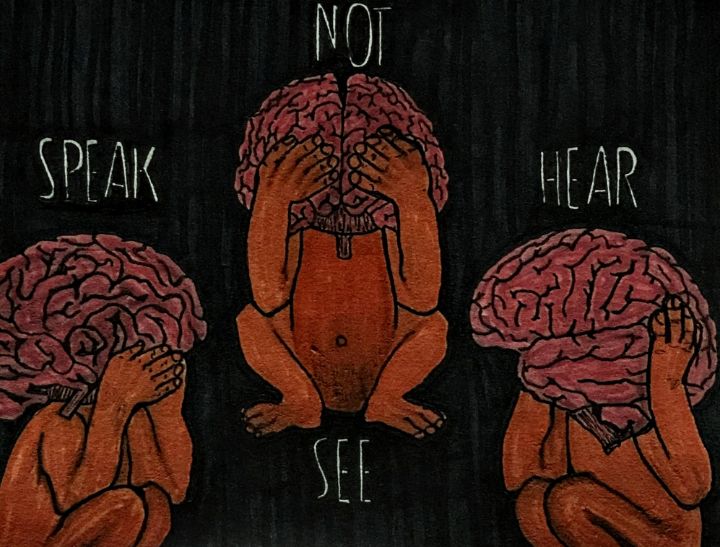 While almost lost in the darkness as if in hiding, we see a clever portrayal on the classic “see no, hear no, speak no” parable. The three monkeys are squatting on their haunches and protecting them from the three senses. All this whilst their brains are fully exposed, and as the heads in entirety. The descriptive words are in a phantom like smokey white font merely muttering the parabolic phrases.