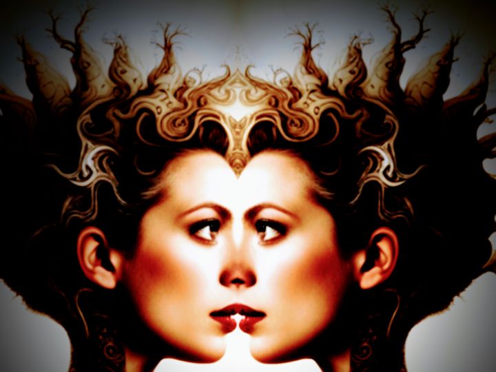 In this cameo inspired surreal piece, portraying both duality and onen neaess simultaneously, we find ourselves caught somewhere in the middle. It vaguely suggests the two alter egos of one, while also hinting on the fact that there is something in disguise within the subject, in this case; one of a beautiful woman revealing a young and off colored seeming male figure. Both beautiful, and abstract, and the use of purely neutral tones, with the subject just slightly off center, this piece is rather difficult to ignore as it demands much attention from the imagination.