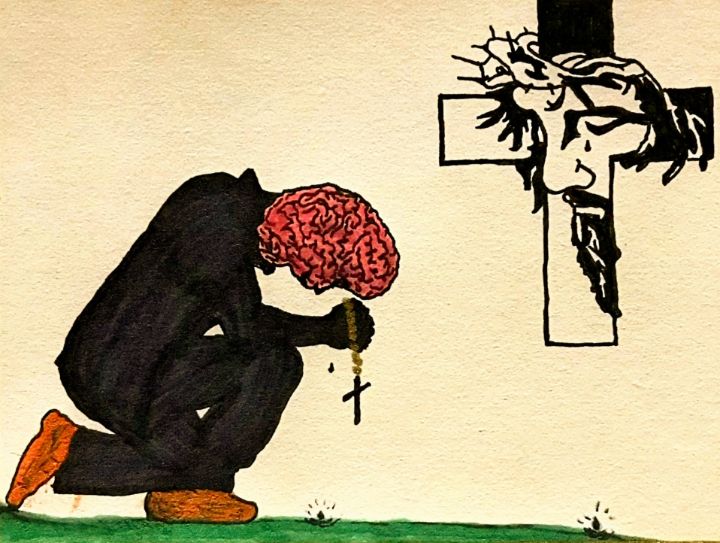This seemingly simple depiction will actually catch you “dead” in your tracks. Here we see a man of faith on a bent knee in prayer at the foot of a crucifix. The crucifix portrays the face of the Lord and savior of Christianity “Jesus Christ”. We see both the man with a completely exposed brain and the risen form of Christ weeping together, thus suggesting the pain, joy, and understanding between both man kind and the divine.