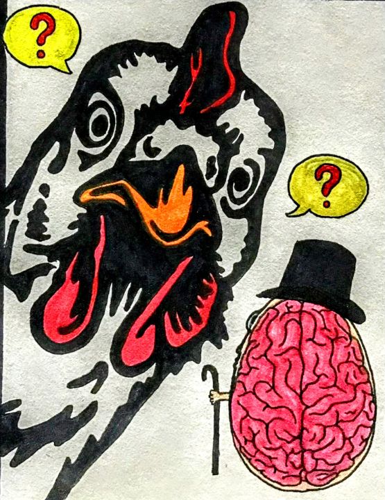 The age old question; What came first, the chicken or the egg..? Here we see both of the subjects pondering this timeless conundrum in a hearty laugh provoking manner seemingly fit and appropriate for the nature of such a query.