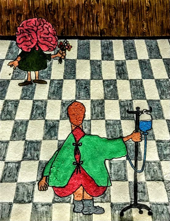 Here we find ourselves viewing a scene set in an institutional hospital, where a brain is bringing flowers to a heart wandering the hallways of the infirmary. The heart appears to be lost, broken, or confused as it saunters about; with its back towards you thus hiding its expression leaves mystery hidden in the truth of the matter.