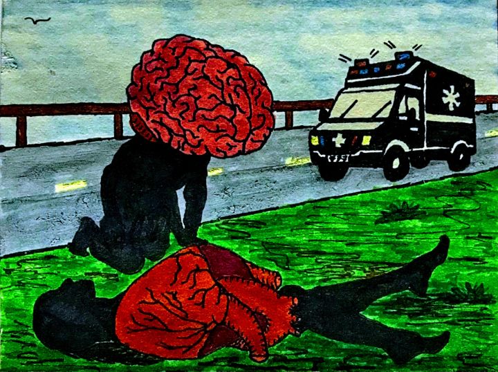 This tragic image of a masculine anthropomorphized brain administering C.P.R. to a feminine anthropomorphized heart along a roadside with an ambulance on scene leaves one to only ask; what happened? What does this mean..? It is the representation of the integral codependency that is vital to human life between the two hyper-imperative love and logic organs of our bodies.